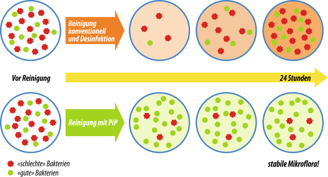 Vergleich herkömmliche Desinfektion - PiP-Reinigung